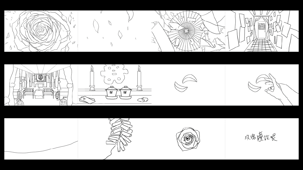 The tone of the title sequence will be dark and eerie. Visual elements like an eye rose, joss paper(spirit money), red lines, and divination blocks will be used to symbolize a traditional and horrifying Taiwanese wedding, at the same time conveying the show’s genre.